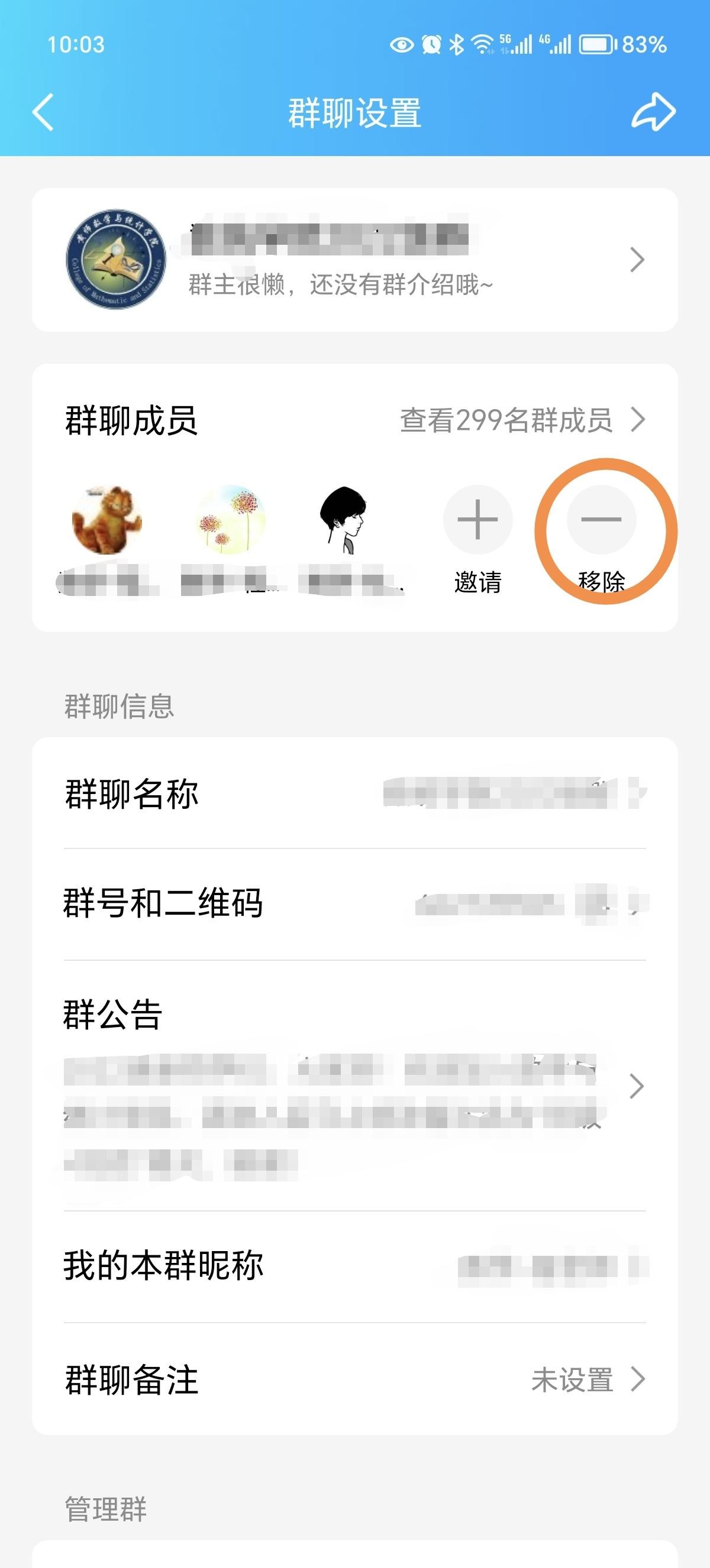 第一步:进入“群聊设置”,找到“移除”按钮。
