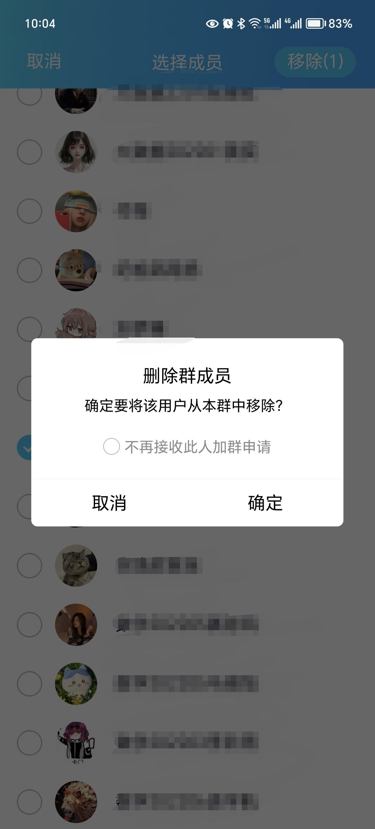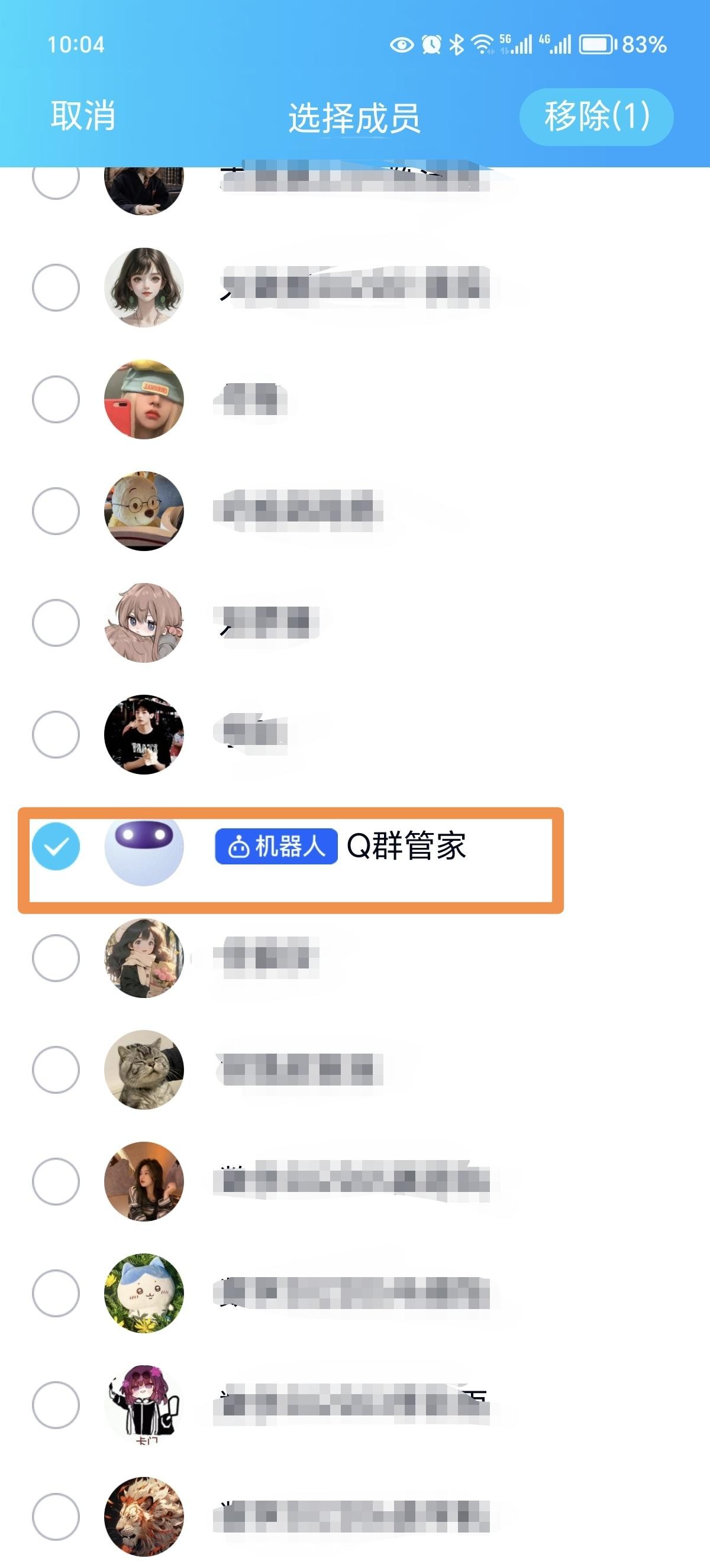 第二步:点击进入“移除”选项,可以看到所有的群成员,勾选“Q群管家”机器人。