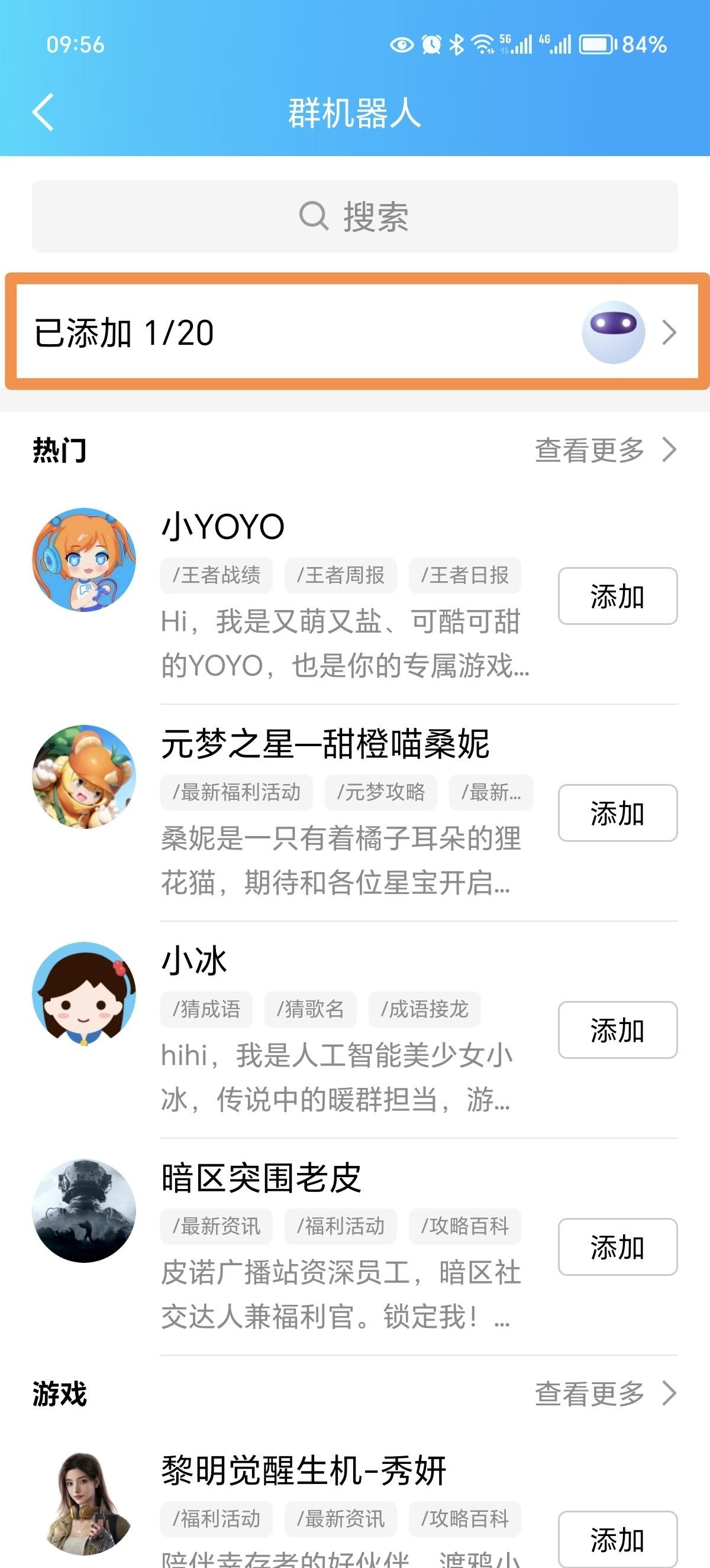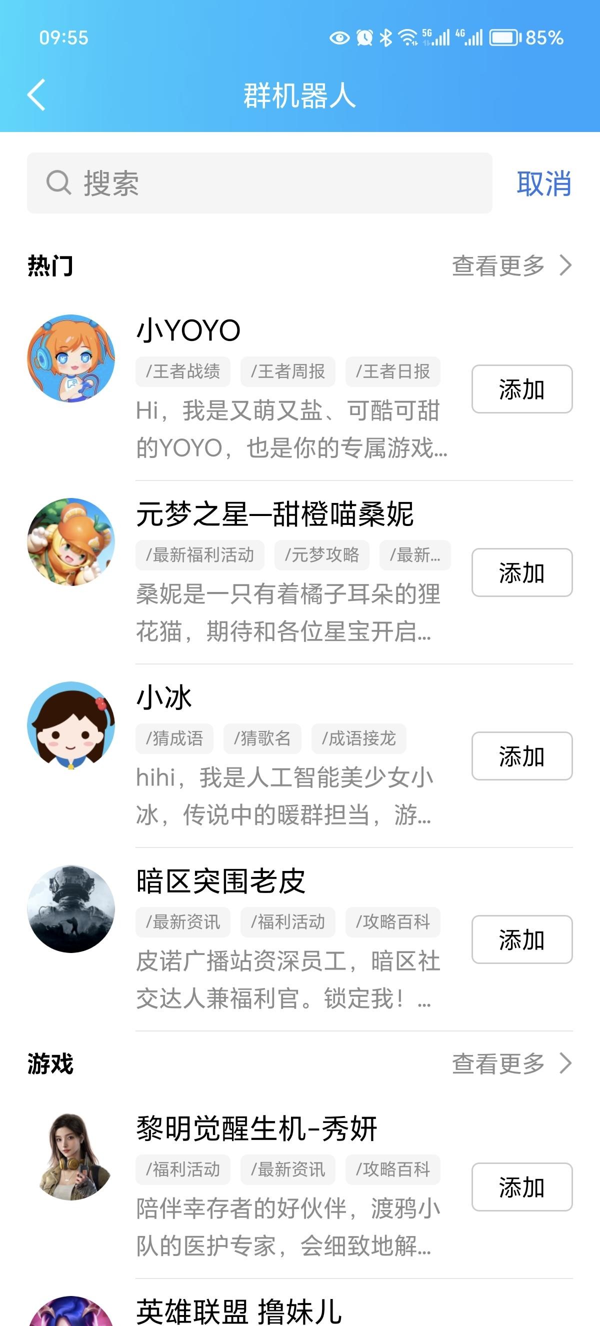 第三步:点击进入“群机器人”选项,就可以看到有很多人工智能AI角色可供选择。比如小YOYO、小冰和暗区突围老皮等等。这里我们需要用到的机器人是Q群管家,在搜索栏中输入“Q群管家”,即可看到Q群管家的图标出现。