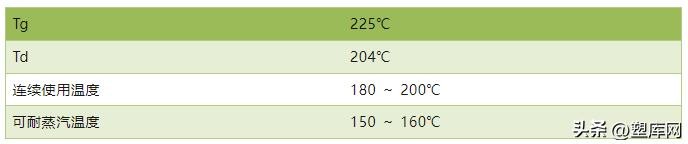 耐热性高:200℃以下机械性能不变,-150℃低温下仍不脆裂;Tg为225℃,Td>203℃。