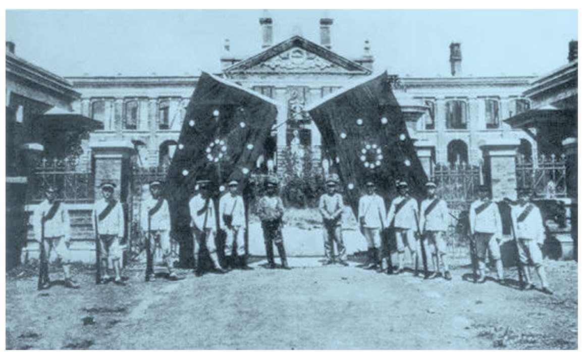 武昌起义革命军,背后是革命军旗帜“十八星旗”