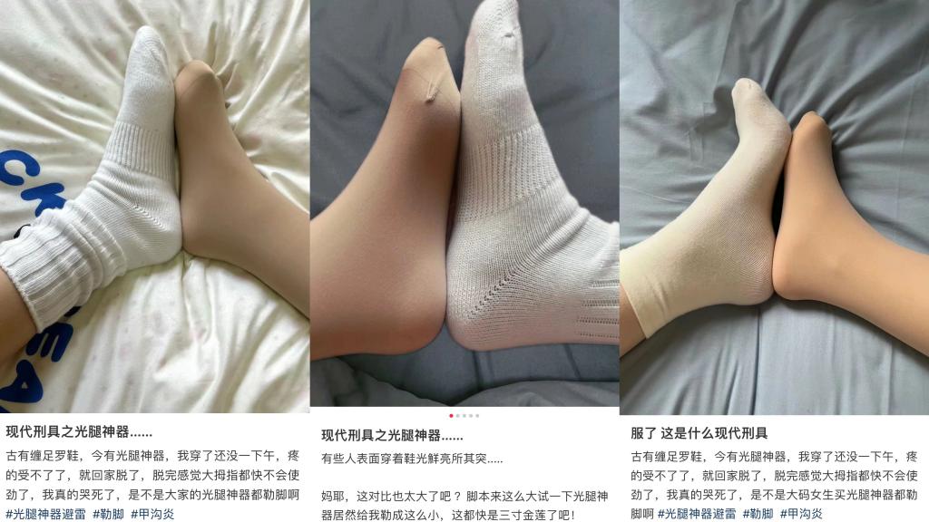 " 古有缠足罗鞋,今有光腿神器,我穿了还没一下午,疼得受不了,回家脱了,感觉大拇指都快不会使劲了。" 一位网友在小红书上的吐槽引发了不少人的共鸣," 光腿神器就是反人类设计 "" 我也快被勒死了 "" 这真是现代缠足 "" 原来不止我一个人勒脚趾头 "" 每次穿我的脚都被勒的巨痛无比 " ……