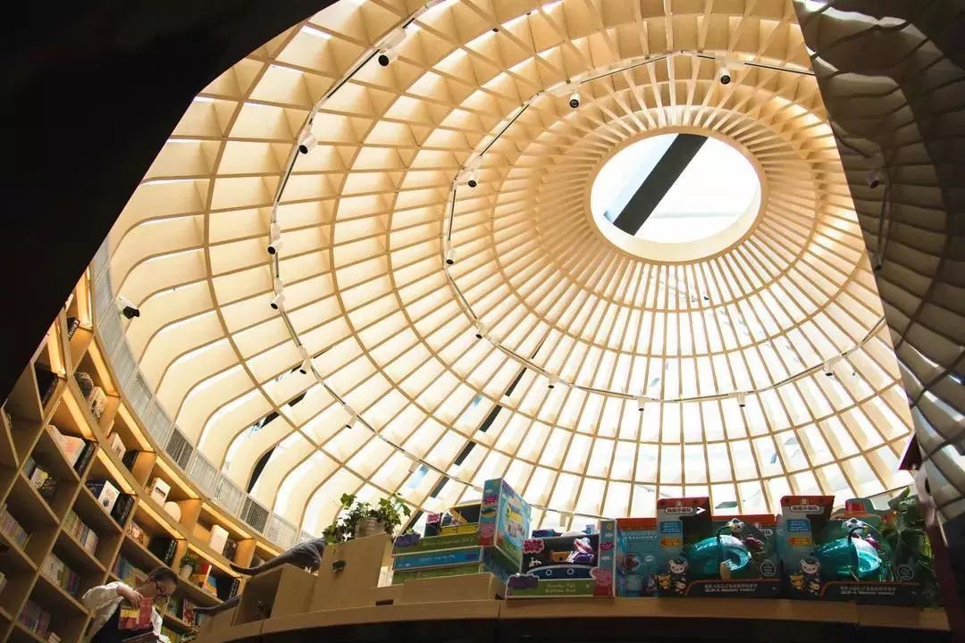言几又浐灞砂之船店致力于打造城市闹市中的休憩文化空间,空间打造希望能够遵循自然,尊重自然,建筑形式上采用穹顶的造型,结合空间,灯光的设计,营造星空点点的环境氛围。星空,书海,自然而让人静谧。