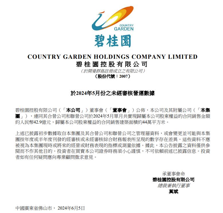 6 月 5 日晚间,碧桂园对外披露最新销售数据。2024 年 5 月,公司共实现归属公司股东权益的合同销售金额 42.9 亿元;归属公司股东权益的合同销售建筑面积 44 万平方米。