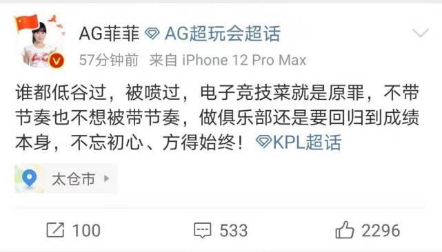 在QG老板回应之后,AG老板菲菲也得到了这个消息,她是非常生气的,罕见直接向QG老板发火了。AG菲菲表示“谁都低谷过,被喷过,电子竞技菜就是原罪,不带节奏也不想被带节奏,做俱乐部还是要回归到成绩本身,不忘初心、方得始终!”言外之意,警告QG老板好好管理自己的俱乐部,不要瞎带节奏。
