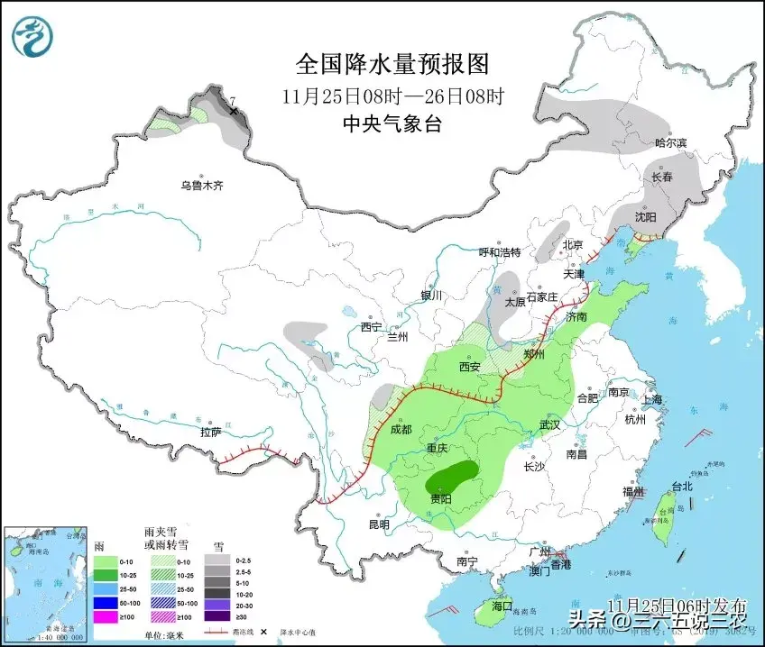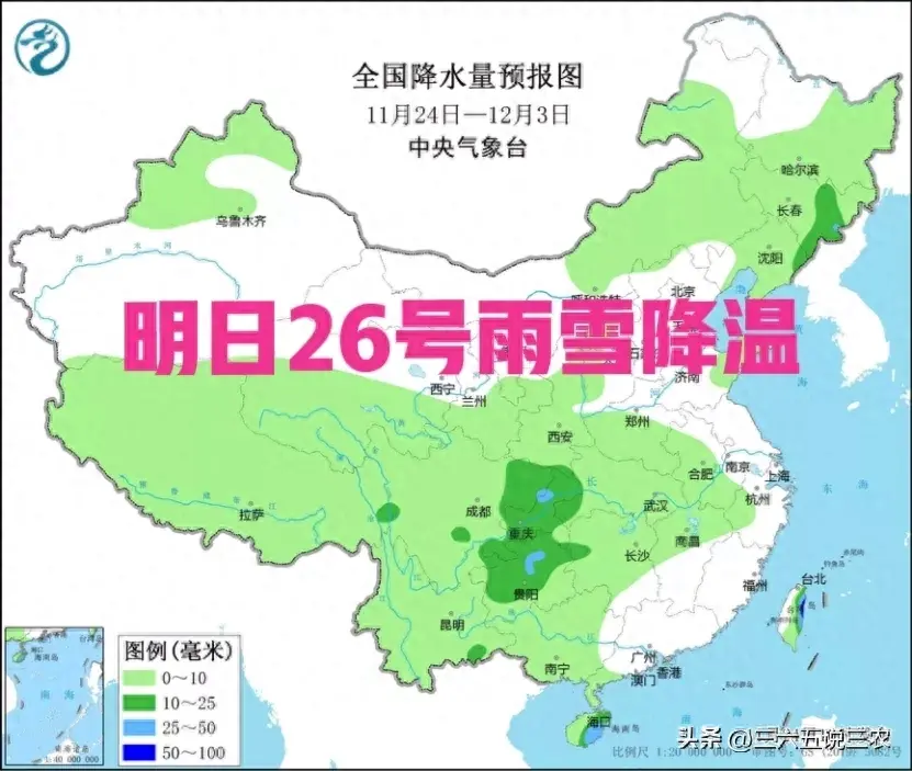 明日26号天气预报,新一轮寒潮冷空气来袭,降雨降雪分布下列地区