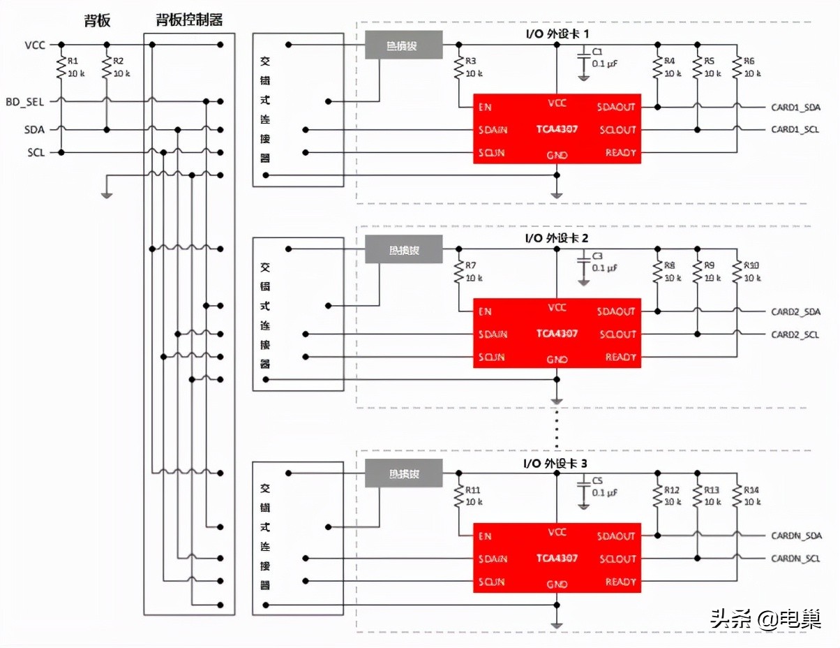 以TI的TCA4307为例——TCA4307 热插拔 I2C 总线缓冲器支持将 I/O 卡插入带电背板,而不会损坏数据和时钟总线,适用于背板连接。TCA4307在 I/O 外设卡上,当发生热插入事件时可将卡上的 I2C 设备安全地连接到背板。建立连接后,该器件将提供双向缓冲,从而使背板和卡的电容保持分离。