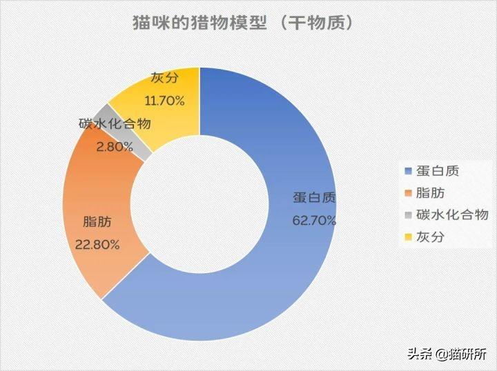 研究人员统计了猫咪在自然状态下的猎物组:包括大鼠、小鼠、田鼠、兔子、禽类、爬行动物、鱼类等,发现猫咪在自然状态下的食谱,包括了55.6~69.1%的粗蛋白,9~31%的粗脂肪,以及0~12.9%左右的碳水化合物。