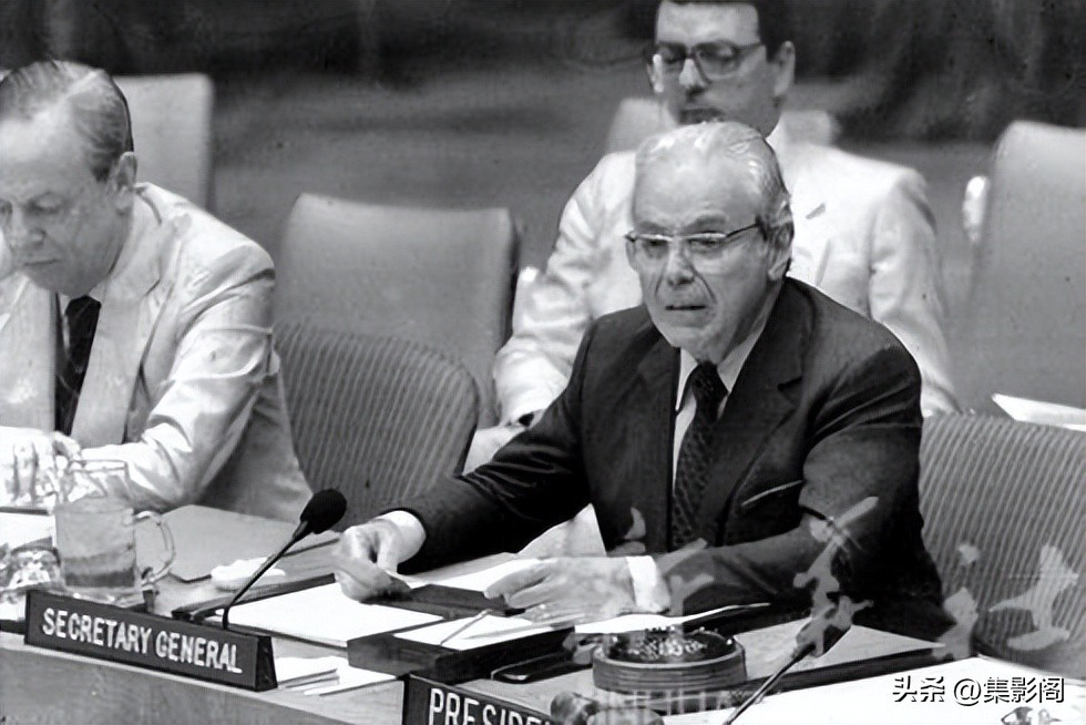 1988年8月8日,联合国秘书长德奎利亚尔(右)在联合国安理会上宣布,伊朗同伊拉克交战双方将于8月20日开始实施停火并于5天后在日内瓦举行直接会谈,以结束双方长达8年之久的冲突。