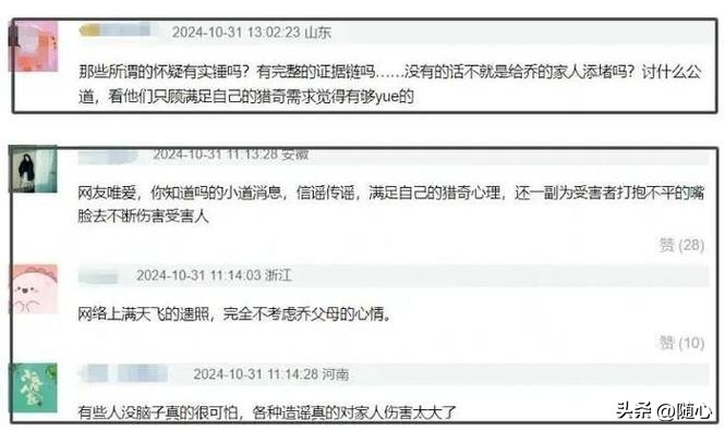 咱们得提高自己的辨别能力,学会甄别真假信息。看到那些不靠谱的消息时,千万别急着转发,先想想是不是真的。还有如果发现有人造谣,要及时举报,让相关部门来处理。说到这里我想起了乔任梁的父母。他们失去儿子已经够痛苦的了,还得承受这些谣言带来的伤害。据说乔任梁的母亲现在每天都过得提心吊胆的,生怕看到那些恶毒的评论和刺耳的声音。
