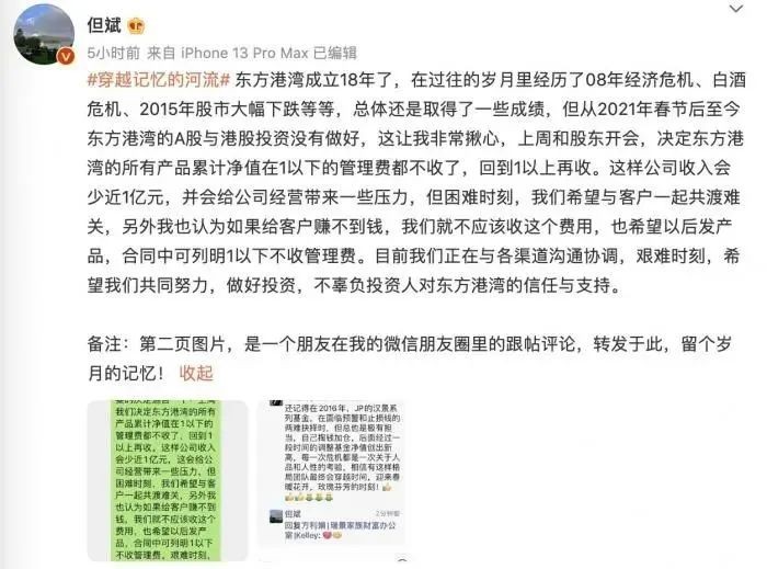 他认为,“如果给客户赚不到钱,就不应该收这个费用,也希望以后发产品,合同中可列明1以下不收管理费。目前我们正在与各渠道沟通协调,艰难时刻,希望我们共同努力,做好投资,不辜负投资人对东方港湾的信任与支持。”