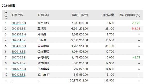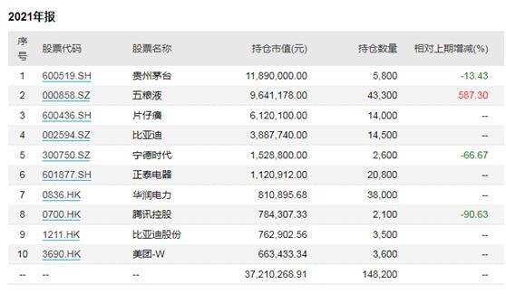 其中,片仔癀、比亚迪、亿纬锂能、歌尔股份等均以“新面孔”出现在该资管计划的前十大重仓股名单中,贵州茅台为其第一大重仓股。宁德时代被减持48.72%持仓股份,腾讯控股因被减持直接退出了前十大重仓股名单,而五粮液获增持幅度达843.33%。
