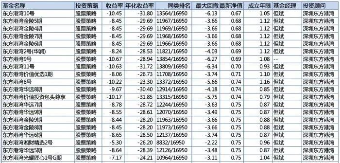 今年以来,东方港湾旗下东方港湾11号证券投资基金、东方港湾华远8期、东方港湾湘财精选2号等多只私募产品净值跌破了0.8元传统的警戒线。