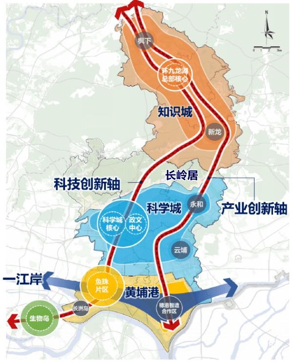 “一岸”是指构建沿江“最强最美十公里”产业岸线。“双轴”即以创新大道和开放大道为轴,以创新大道为科技创新轴,串联知识城、长岭居、科学城、长洲岛和生物岛。“三片”是指从北到南推动知识城、科学城、黄埔港“三片区”互动发展。