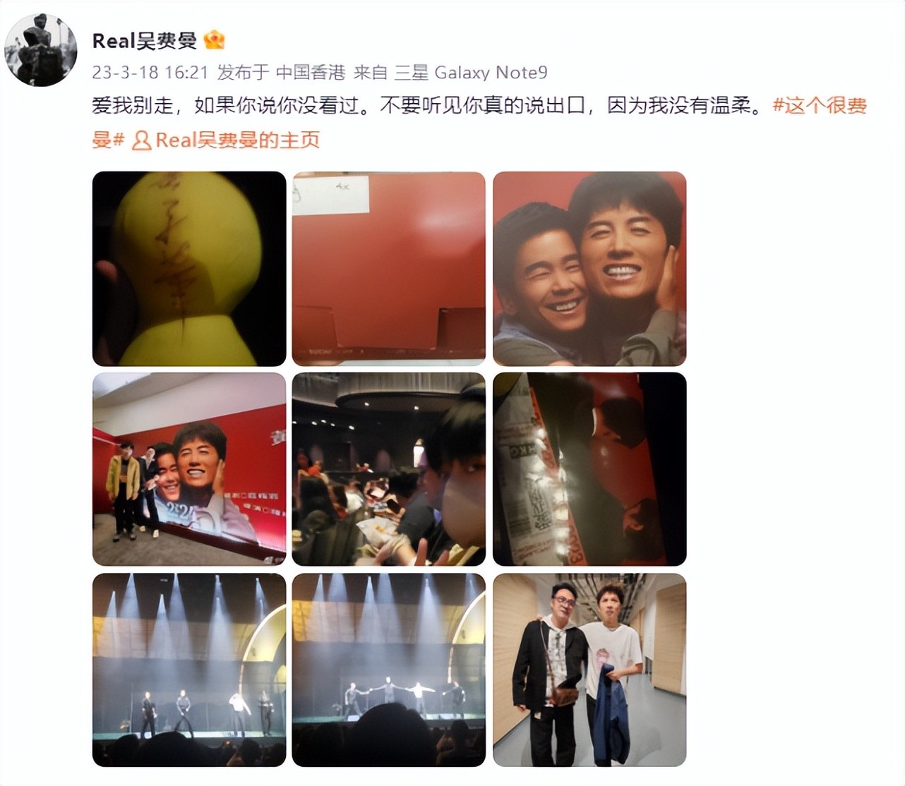 费曼在社交媒体上晒出了与吴镇宇一同观看舞台剧《爱我别走》的照片,并使用歌词改编的文案进行宣传:“爱我别走,如果你说你没看过。“