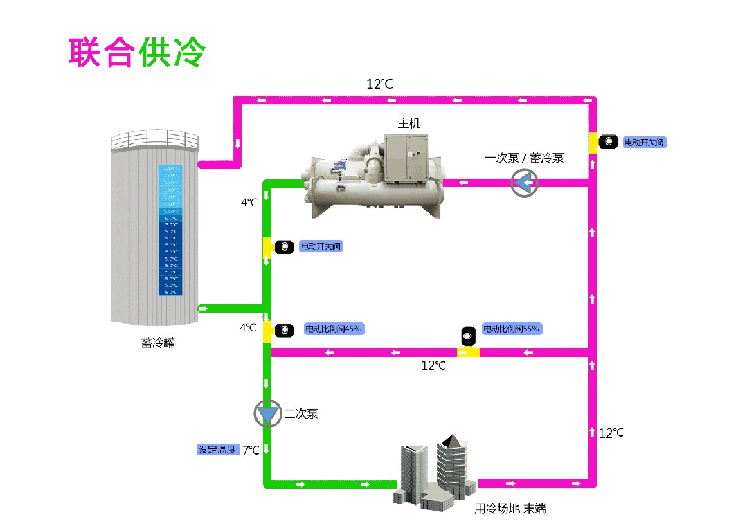 释冷阶段(联合供冷):在电网负荷高峰和空调负荷大的白天,冰蓄冷设备不再制冷,而是通过载冷剂与空气处理单元(AHU)或风机盘管等设备接触,载冷剂吸热融化,释放储存的冷量,为建筑提供冷气。