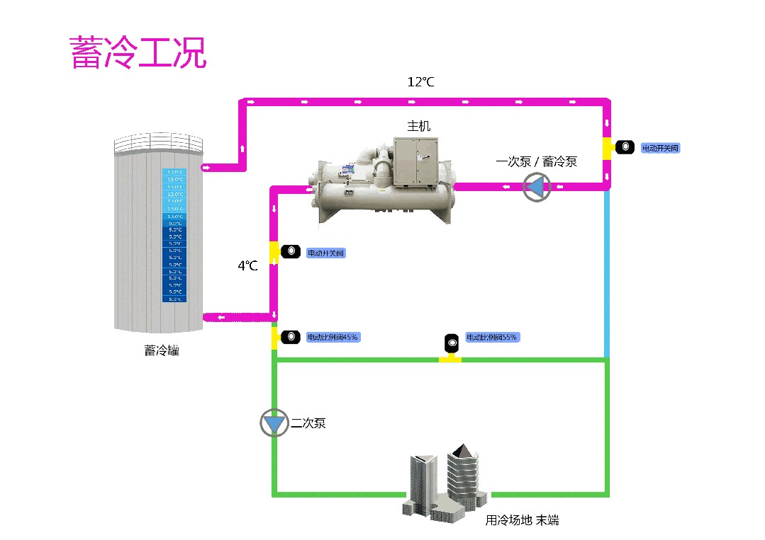 蓄冷阶段:在电网负荷低谷期间,冰蓄冷设备(如冰蓄冷罐)中的载冷剂(通常是水)通过制冷机组冷却至冰点以下,形成冰晶或者冰水混合物,储存冷量。