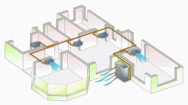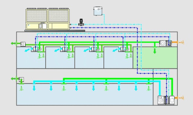 系统构成的主要设备:主机端部分、冷水机组;空调循环水泵,冷却水循环泵(潜水泵)、空调区域(空调末端主要设备)、全空气空调处理机组(包括新风机组),风机盘管。夏季提供冷冻水(7/12℃);冬季提供热水(45/40℃)