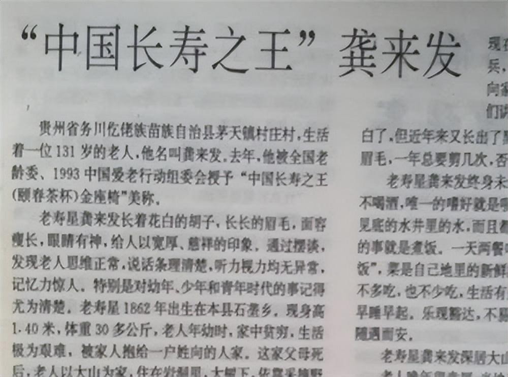 1993年,中国老龄委员会和93全爱老行动组委会在老人节上举办了“中国百岁寿星排座次”的活动,龚来发是当时年龄最长的老人,以131岁的年纪轻松拿下榜首。