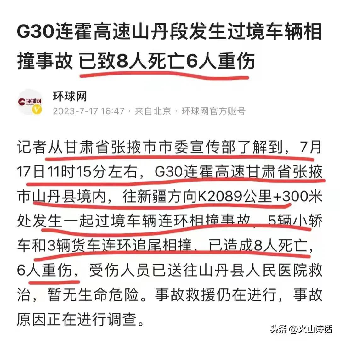 7月17日上午11时左右,位于甘肃省张掖市山丹县境内的G30连霍高速公路发生了一起严重的5车连环相撞追尾的严重事故。事故涉及五辆车,其中包括四辆小轿车和一辆厢式货车。事故造成8死6重伤!