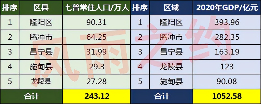 隆阳区常住人口为90.31万人,与第六次人口普查相比减少3.25万人,是保山市常住人口最多、经济实力最强的区县,2020年全区GDP总量为393.96亿元,无论是人口还是GDP,均大幅领先于其他县市,是保山市毫无疑问的经济中心。