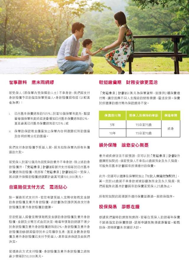 “充裕未来 2”加入了一个小型信托计划(假如受保人的身故赔偿超过 50,000 美元,保单持有人能够在其身故时安排分期支付赔偿,按照年/半年/季/月为保单的受益人提取不少于身故赔偿总额 2%的现金),并且无需任何额外费用。