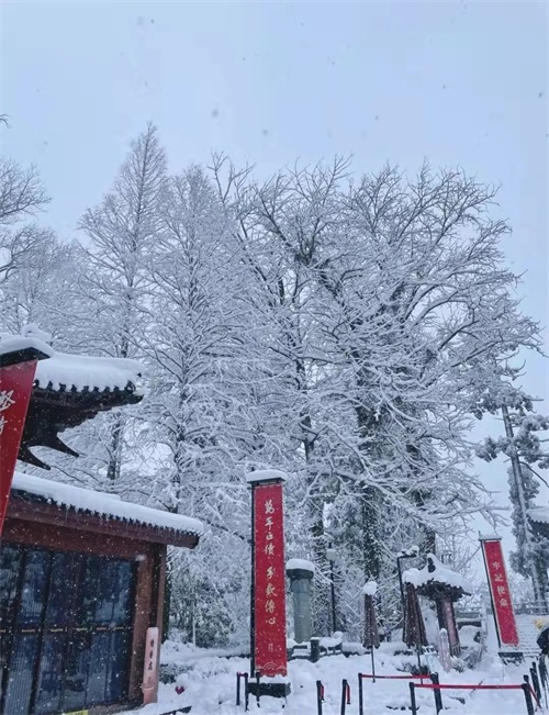 雪和寺庙果然是绝配,径山寺在一片白雪皑皑中挺立,就是现在寺庙暂未开放,只能徒步上山。雪天路滑,大约需要1个多小时。