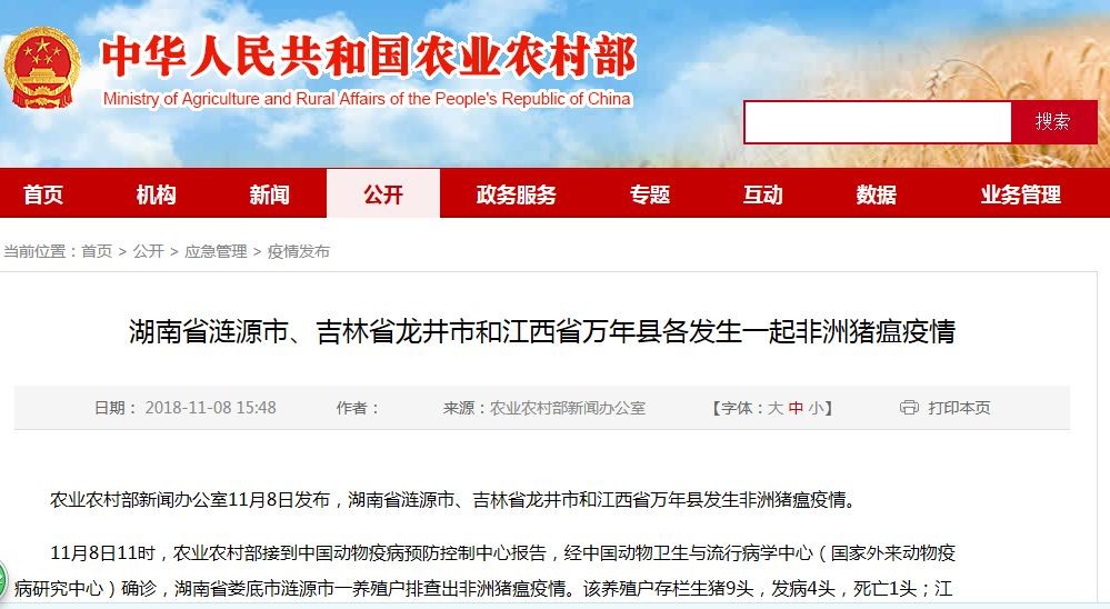 11月8日,农业农村部发布消息,江西上饶万年县一养殖户排查出非洲猪瘟疫情,该养殖户存栏生猪154头,发病49头,死亡49头。这是江西首次出现非洲猪瘟疫情。