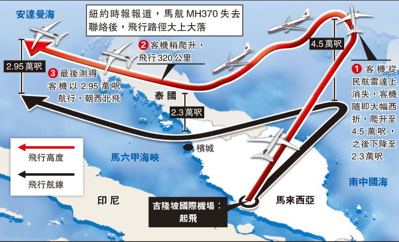 客机失踪前,并未向地面发送求救信号,这让它的失踪变得扑朔迷离。不过客机起飞之前加了足够的燃油,如果它半途改道,地面没收到信息,在原来的预定轨道海域寻找,显然再怎么找也是找不到的。那时多国都展开了搜寻这架客机的工作,却没有找到客机的残骸。