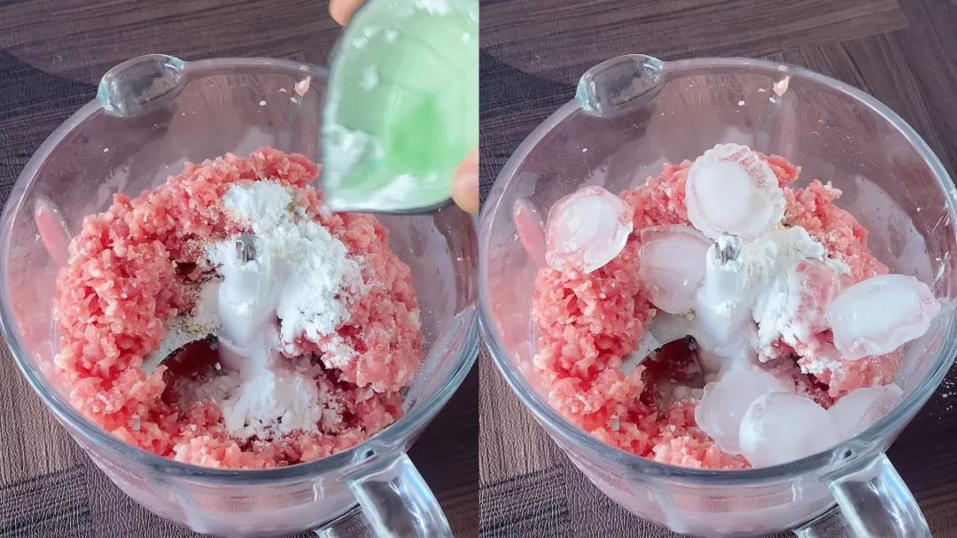 第2步,肉块冻好后,放绞肉机里先绞碎。再进行调味,加10克盐,2克鸡精,1克胡椒粉,3克小苏打,15克木薯淀粉,90克冰块。