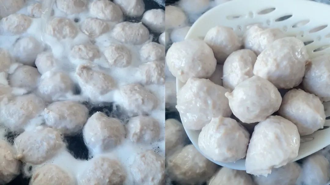第6步,丸子煮好后,捞出立刻放冰水里,利用热胀冷缩的原理,丸子更Q弹紧实。