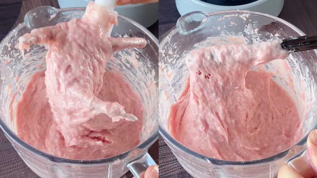 第3步,用绞肉机打成细腻的肉浆。我用的是智能绞肉机,打好会自动停止。普通绞肉机,需要打3~5秒松手停一下,以免绞肉机发热停止工作。打到肉浆发白,挂在刀片上不掉落,就可以了。