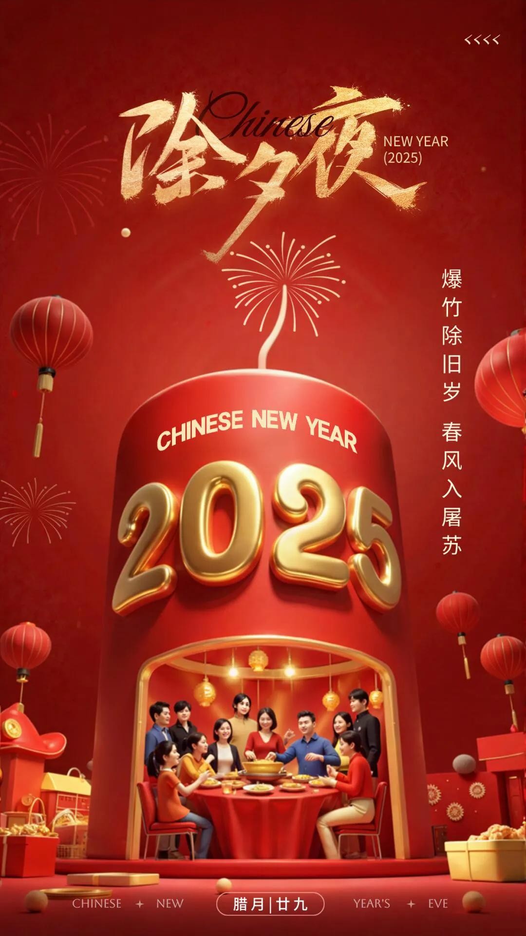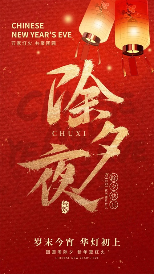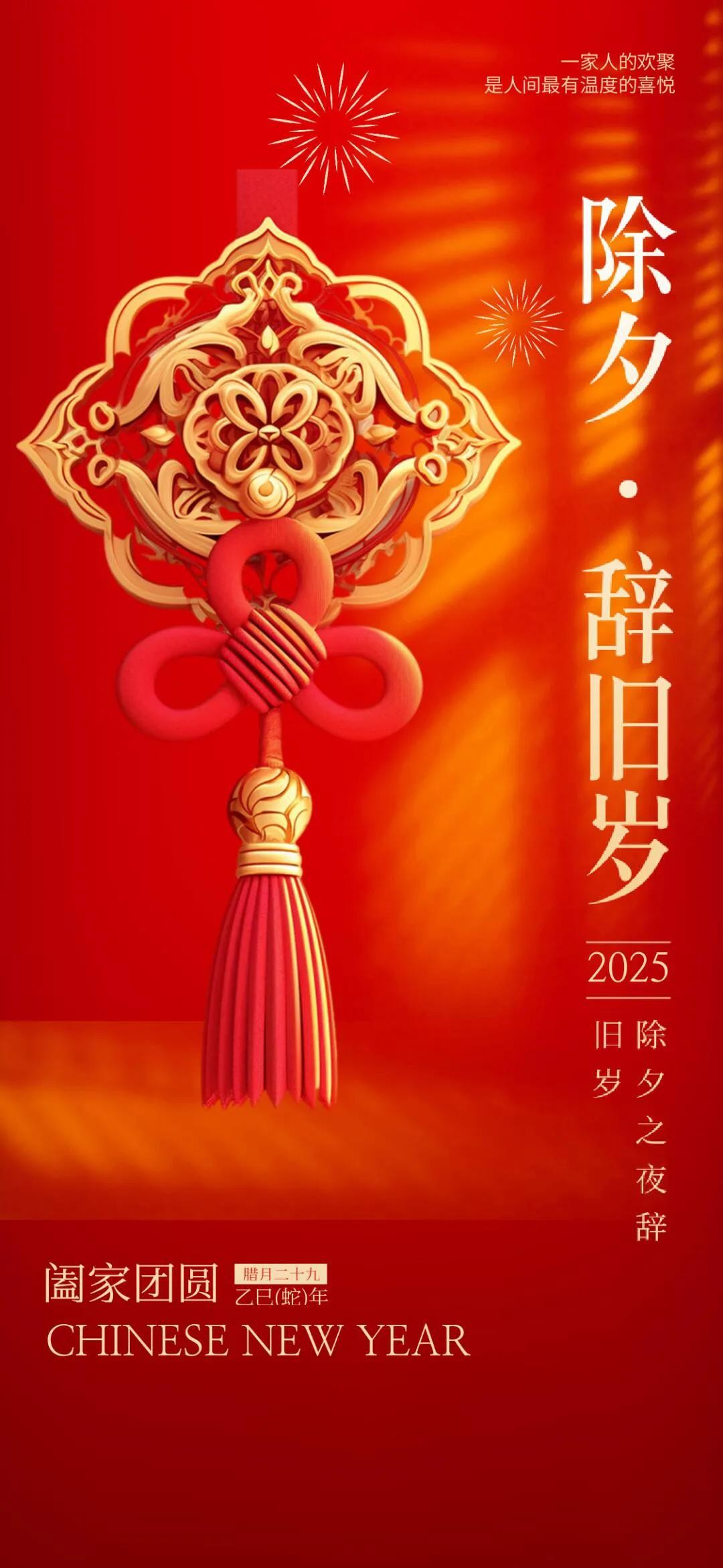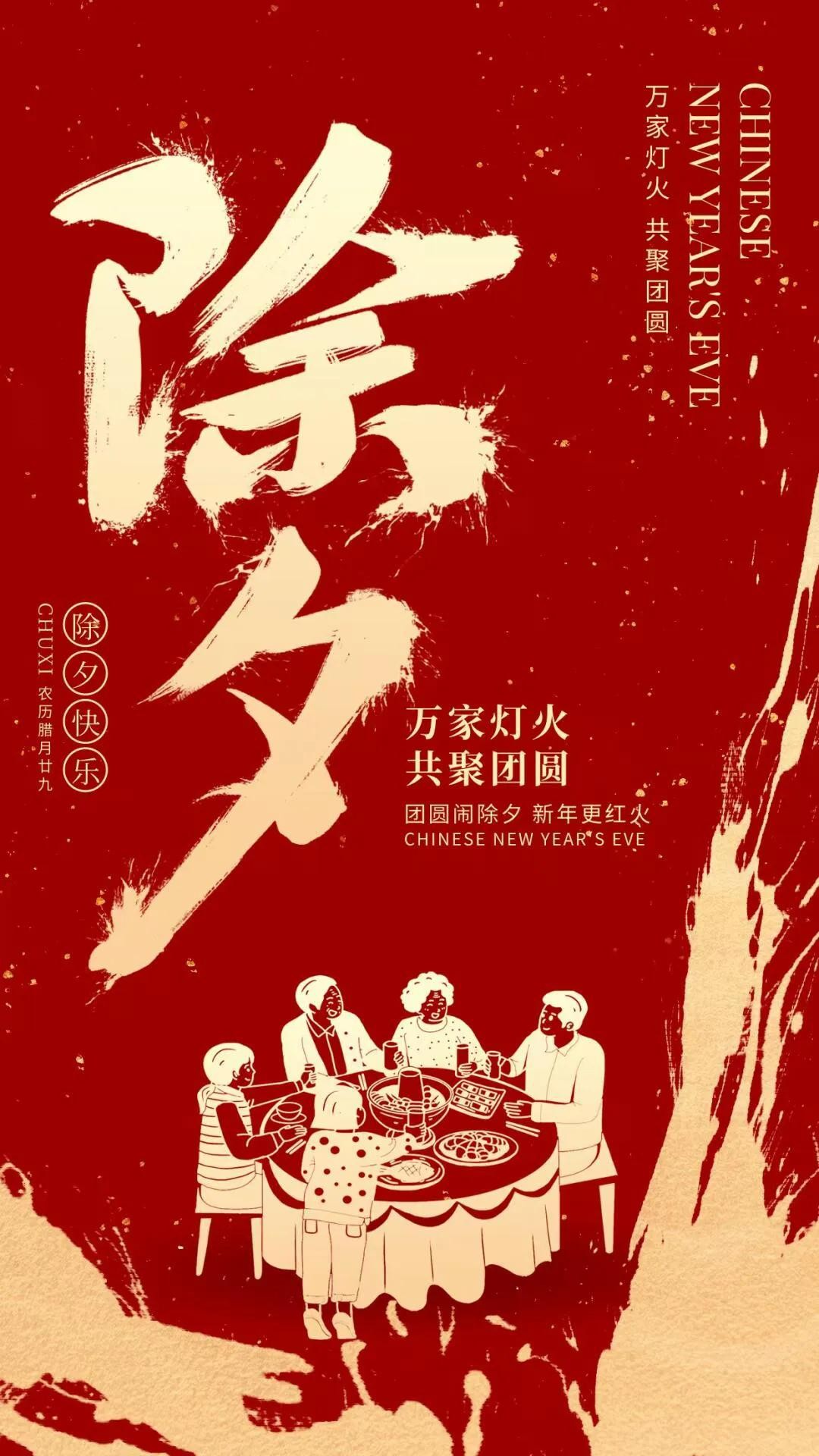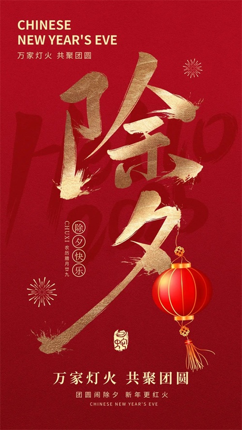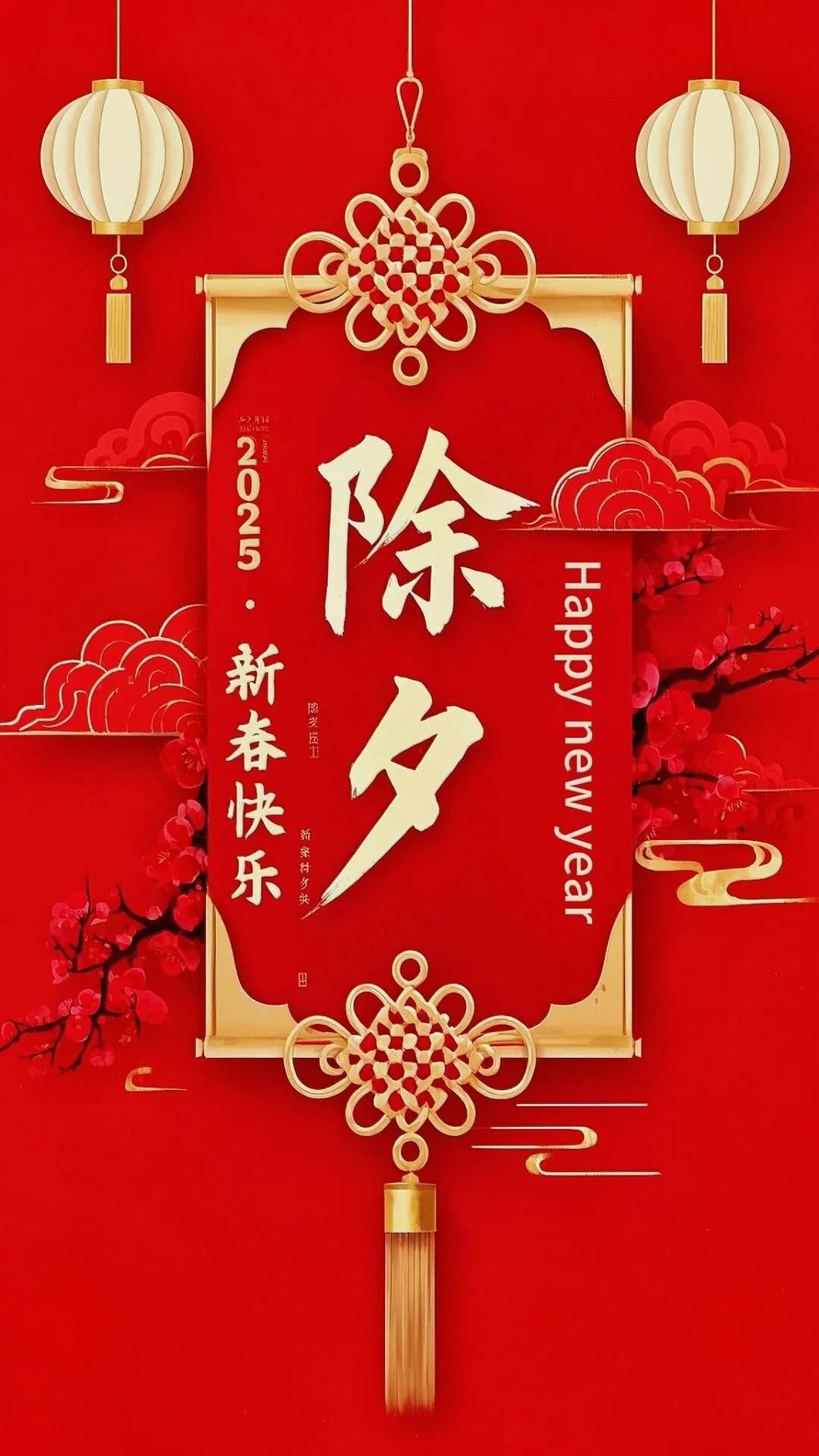 除夕钟声敲响时,新年好运已临门。在这欢乐的时刻,愿您阖家欢乐共团圆,人人脸上展笑颜。新的一年,诸事顺遂无烦忧,万事如意福满盈。让温馨与幸福常伴您左右,祝您新年快乐,吉祥安康!