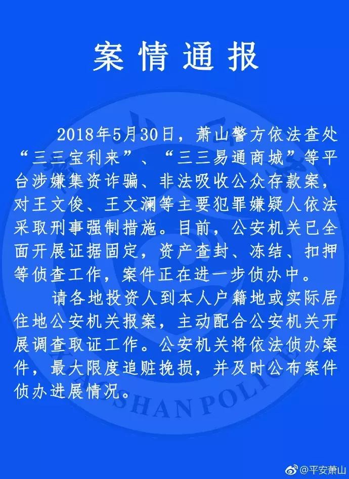 近日,官方微博@平安萧山发布一则“案情通报”:2018年5月30日,萧山警方依法查处三三宝利来、三三易通商城等平台涉嫌集资诈骗、非法吸收公众存款案,对王文俊、王文澜等主要犯罪嫌疑人依法采取刑事强制措施。目前,三三宝利来电商平台APP已经无法打开。