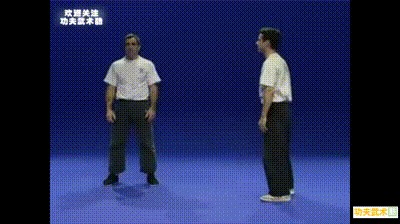 敌我双方错身而立;敌方上左步以左直拳进攻我方上盘;我方立即向左转身90度,同时以左手搂抓敌左手腕,并以右手直拳攻击敌方左耳根要害部位。