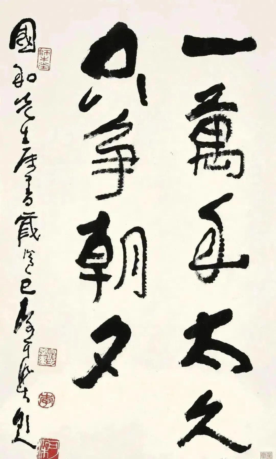 “一万年太久,只争朝夕”是很励志的一句话,警示人们要珍惜年华,积极进取。这幅作品虽是“国和先生属书”,却也是李可染先生一生的写照。纵观李可染先生的一生,他以“可贵者胆,所要者魂”为座右铭,潜心书画,孜孜以求。“胆”者是敢于突破传统的陈腐框框,“魂”者是创作具有时代精神的意境。