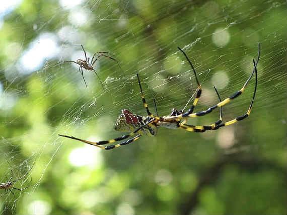 络新妇确实也是一蜘蛛品种,又叫“棒络新妇”或是“横带人面蜘蛛”,是山区常见的大型蜘蛛。身体颜色美丽,头胸部为深褐色,腹部背面有鹅黄和银白相间的斑纹,腹面有两条鹅黄色花纹,周围为鲜红色,脚上有黑黄相间的环纹。身长大约2-3公分,虽然是大型蜘蛛,可是毒性不大,而且毒主要是用来麻痺猎物,对人类最多只能导致些许疼痛。