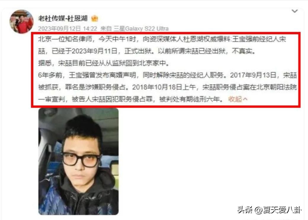 宋喆曾是王宝强的经纪人,但后来因涉嫌职务侵占罪被王宝强起诉,并最终被判刑入狱。这一事件在当时引起了社会的广泛关注,也让宋喆的形象一落千丈。