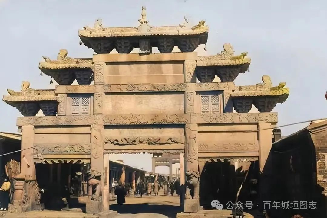 20世纪30年代兴城南大街上,崇祯年间朱友检为镇辽西名将祖氏两人修建了两个“祖家”的石牌。两道拱门一南一北,隔着一百多丈的距离。照片上的这个拱门是“祝寿庆功拱门”。