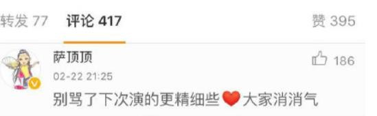 面对网友的调侃,萨顶顶则淡定回复:“别骂了下次演的更精细些,大家消消气!”