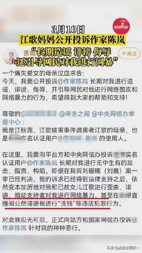 2022年3月10日,江歌妈妈公开投诉陈岚长期造谣、诽谤、侮辱,并且引导网民进行网络围攻和网络暴力。