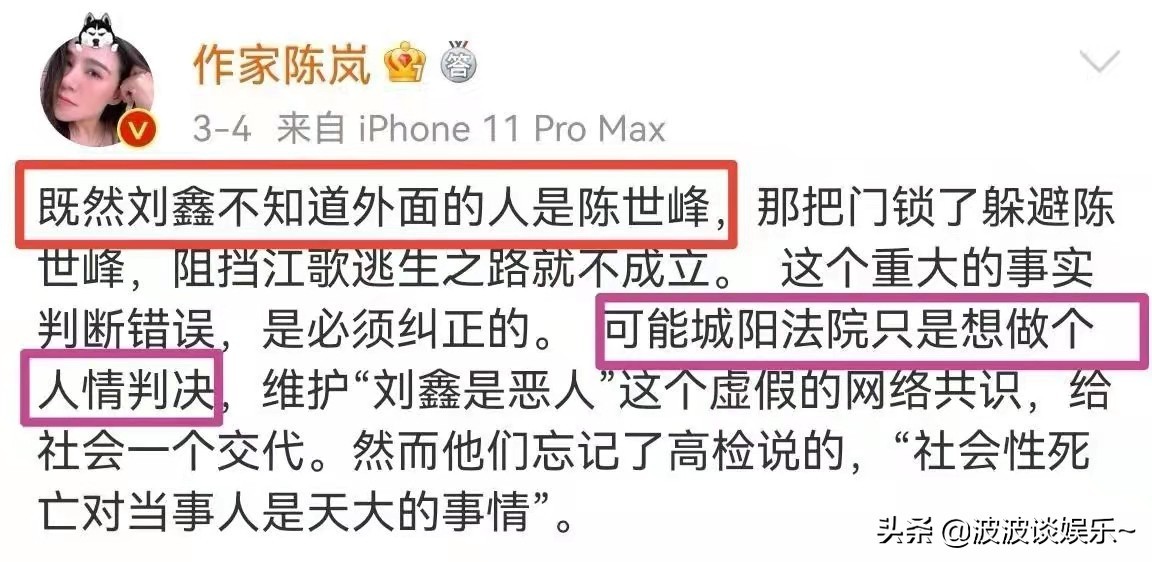 作家陈岚在其拥有153万粉丝的社交媒体账号上,公开宣称一审判决只是一个“人情判决”,是为了维护一个“虚假的网络共识”,给社会一个交代。