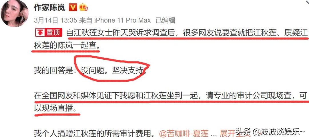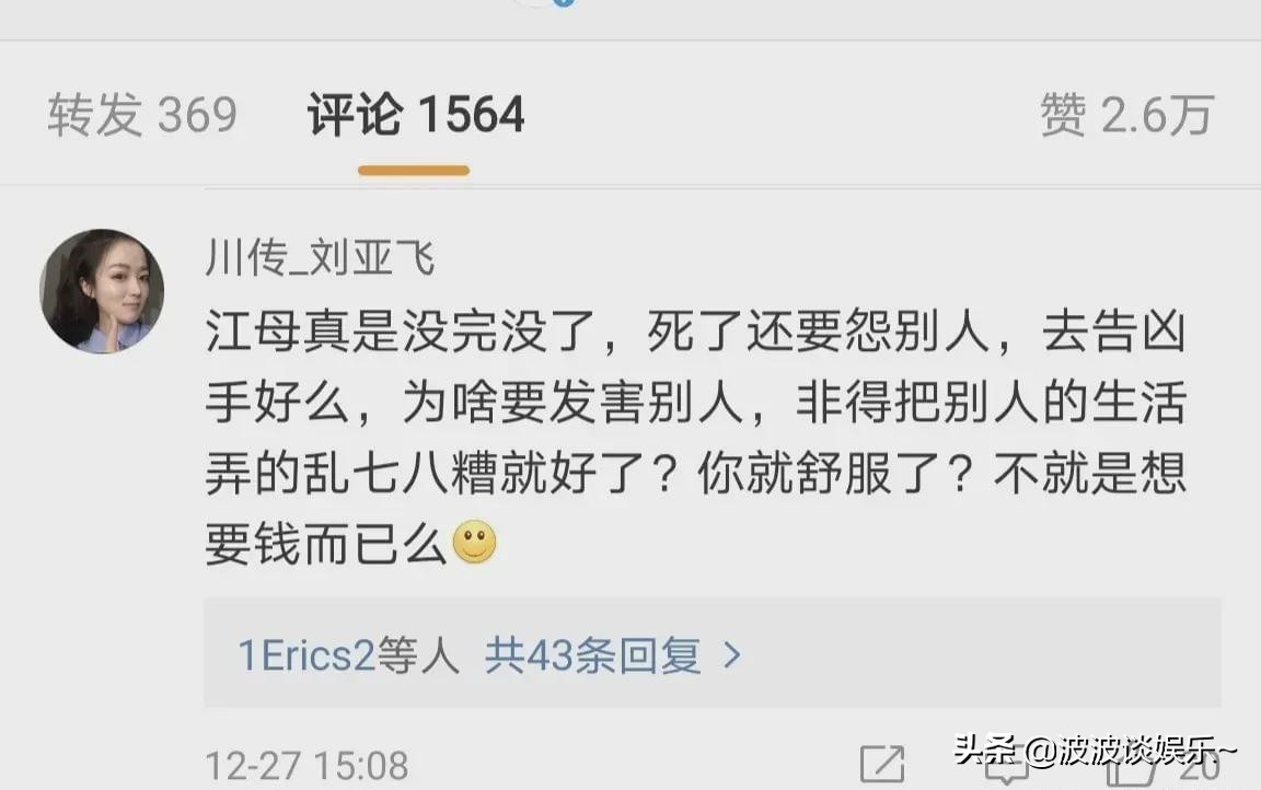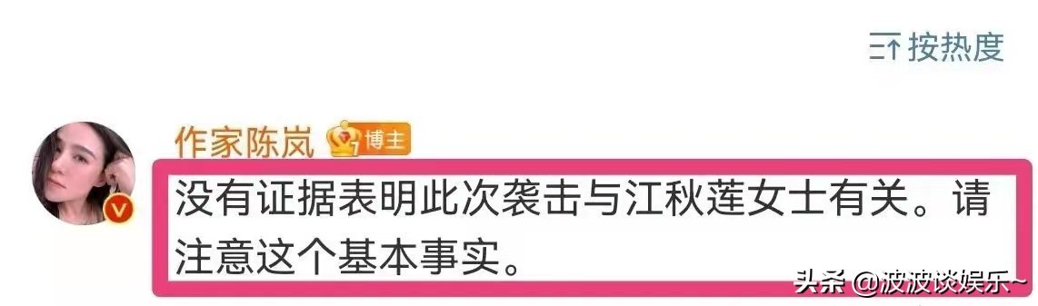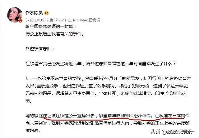 他们之间争论的内容总结起来就三点,一是案情分歧,二是善款去向,三是网暴问题。作家陈岚一直支持案件里的刘某,认为她不仅无罪,而且没有道德上的问题,她认为江妈长期引导网上舆论网暴刘某。