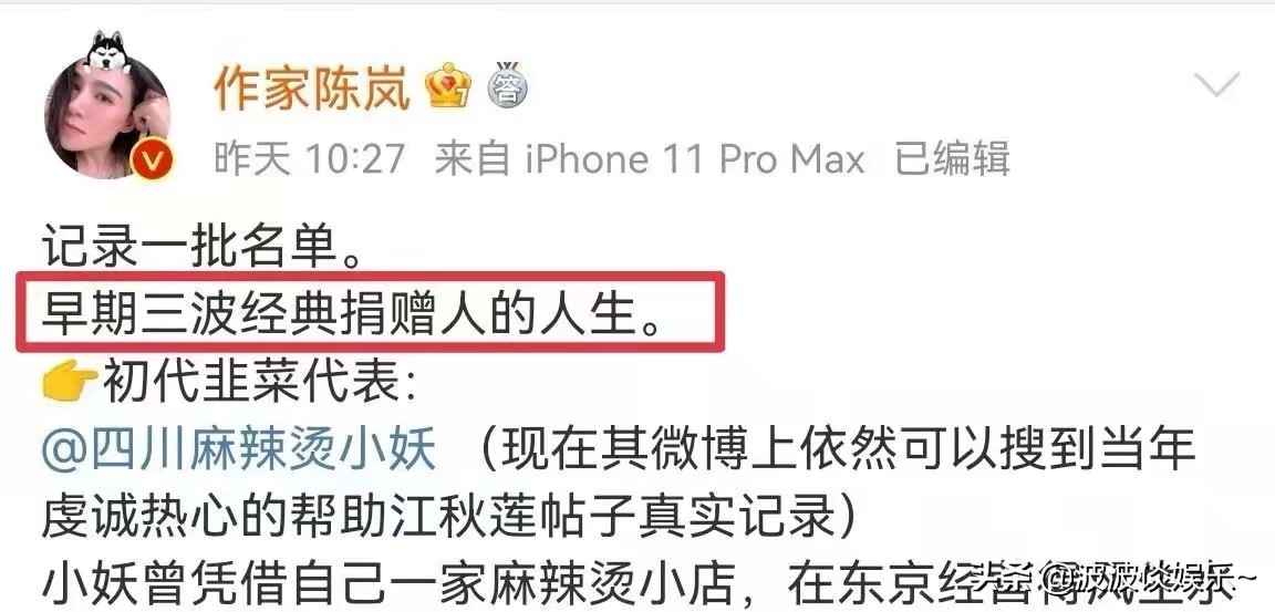 在她一篇名为《早期三波经典捐赠人的人生》的博文中,她把捐赠人称为“韭菜”,分类成“初代韭菜”、“二代韭菜”、“三代韭菜”。