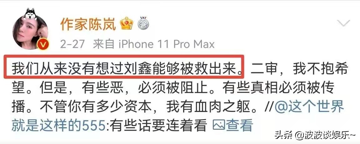 作家陈岚还说这是一次不可理喻的判决,因为没有充足合法的证据,没有合理依法的论证途径,结果也不允许被讨论。她说“我们从来没想过刘鑫能被救出来,二审,我不希望。但是,有些恶,必须被阻止;有些真相必须被传播。”