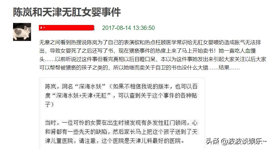 结果当时网名还叫“深海女妖”的作家陈岚认为肛门闭锁可以治疗,谎称自己是孩子母亲,从医院把孩子抢走。不许家人与孩子见面,在北京某私立医院重症监护室7天后,父母把孩子带回天津儿童医院,最终孩子夭折。她还给女婴喂了奶,一个无肛的婴儿,因为没有排气通道,进食会造成腹胀死亡。如果这只是无知的话,她后面的行径就很可怕了。
