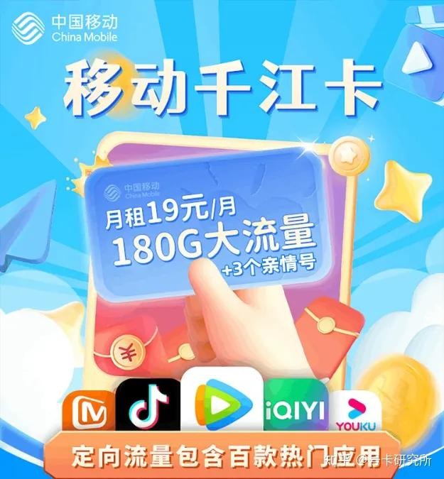 ④【移动19元月租】移动千江卡:19元/月=180G全国流量(150G通用+30G定向)+3个亲情号