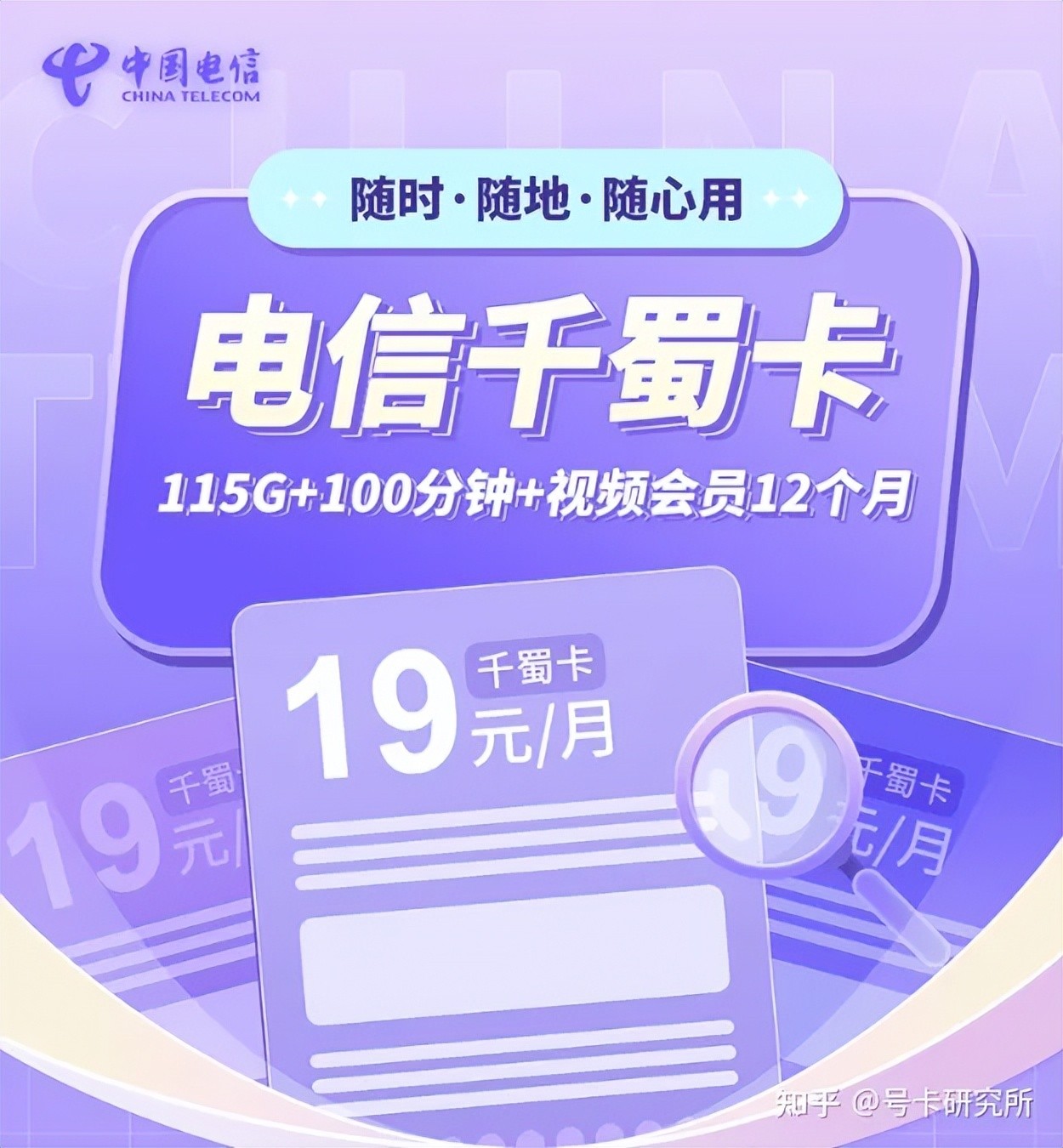 ①【电信19元月租】电信千蜀卡:19元/月=115G全国流量(85G通用流量+30G定向流量)+100分钟语音+赠送1年VIP会员