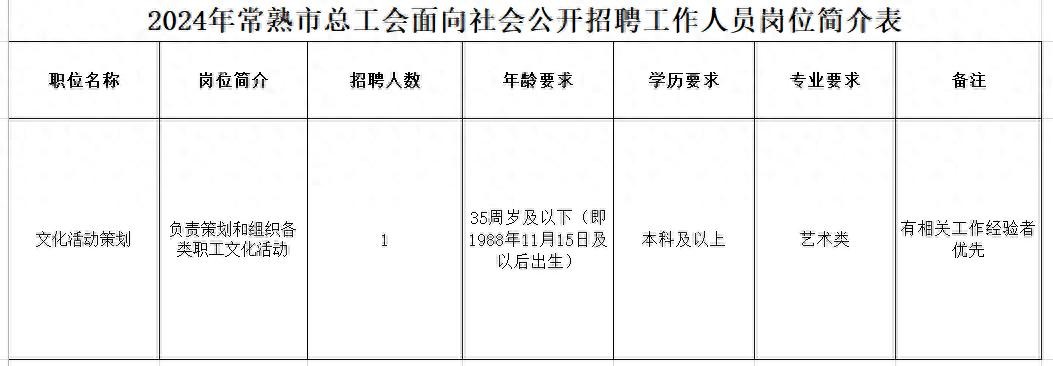 详见《2024年常熟市总工会面向社会公开招聘工作人员岗位简介表》(附件1)。