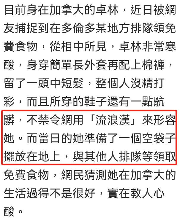 近日,根据港媒的最新报道,久未露面的小龙女吴卓林最新近况曝光,早前因为和母亲吴绮莉的关系持续紧张,母女俩关系降到冰点,吴卓林的社交网站也停止更新。如今吴卓林却被网友拍到现身多伦多,让人意外的是吴卓林竟然在街头排队领取免费的食物,状态不佳,看起来身上的穿着也非常寒酸,被网友吐槽好像流浪汉啊!